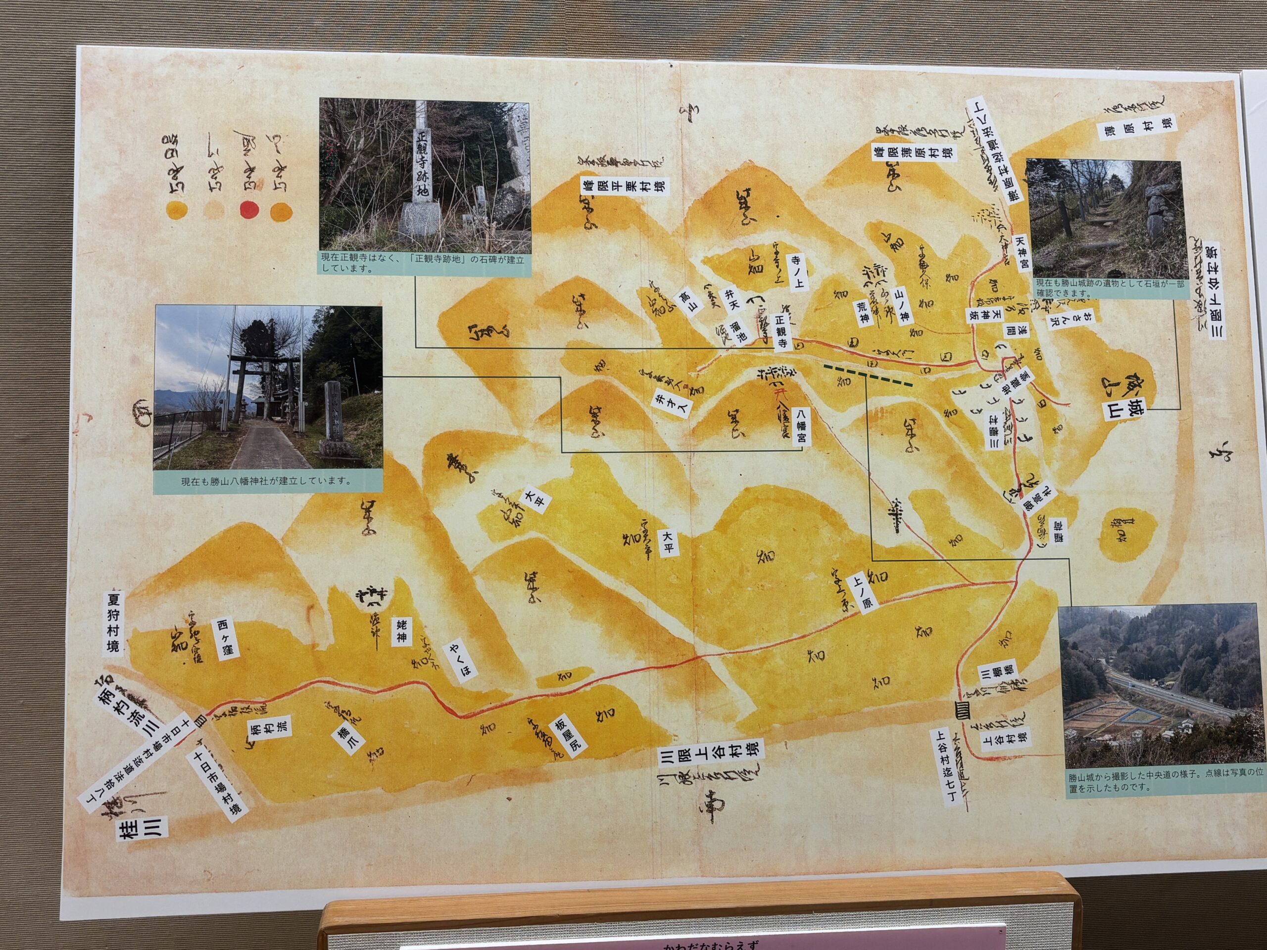展示の大きな見どころの一つは、江戸時代の「絵図」と現代の風景の比較です。数百年前の絵図に描かれた道のカーブやお寺の配置が、今もほとんど変わらずに残っていることがあります。